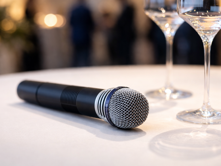 Planning speeches before the dancing begins? Our professional wireless microphone ensures guests can speak confidently and be heard clearly throughout the venue — no cables, no fuss, fully managed by us.